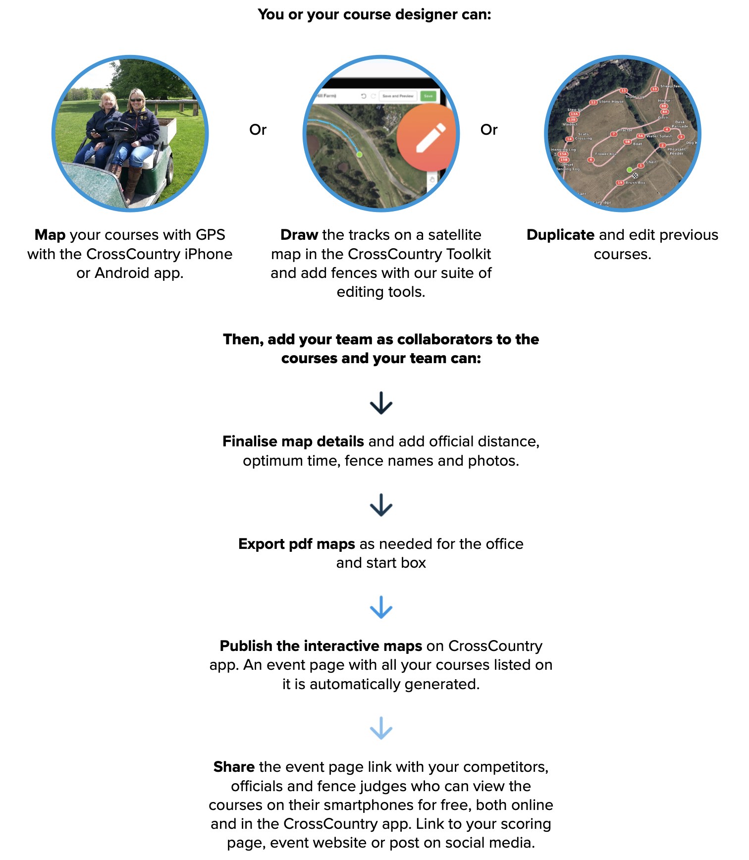 This allows you to record unlimited courses with our algorithmically enhanced accurate GPS, add fence photos and course details and publish them in the library for viewing on CrossCountry app or online.